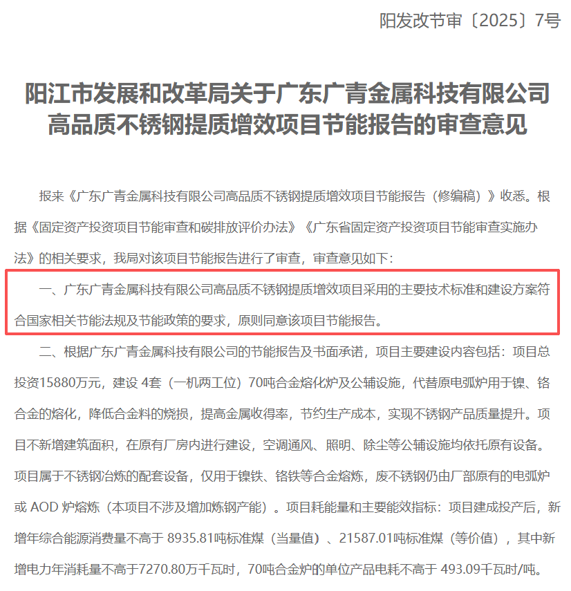 广东广青金属科技高品质不锈钢提质增效项目节能报告获同意通过
